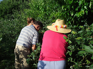 Sunday morning I went and picked blueberries with my SIL & her grandparents. We arrived around 7:00-7:15, this is AM people, and there were already a ton of people picking. We parked, got our buckets, and waited to be assigned a row. We got the very last row (which had the biggest and best blueberries) and off we went. All 4 of us picked a bucket each.